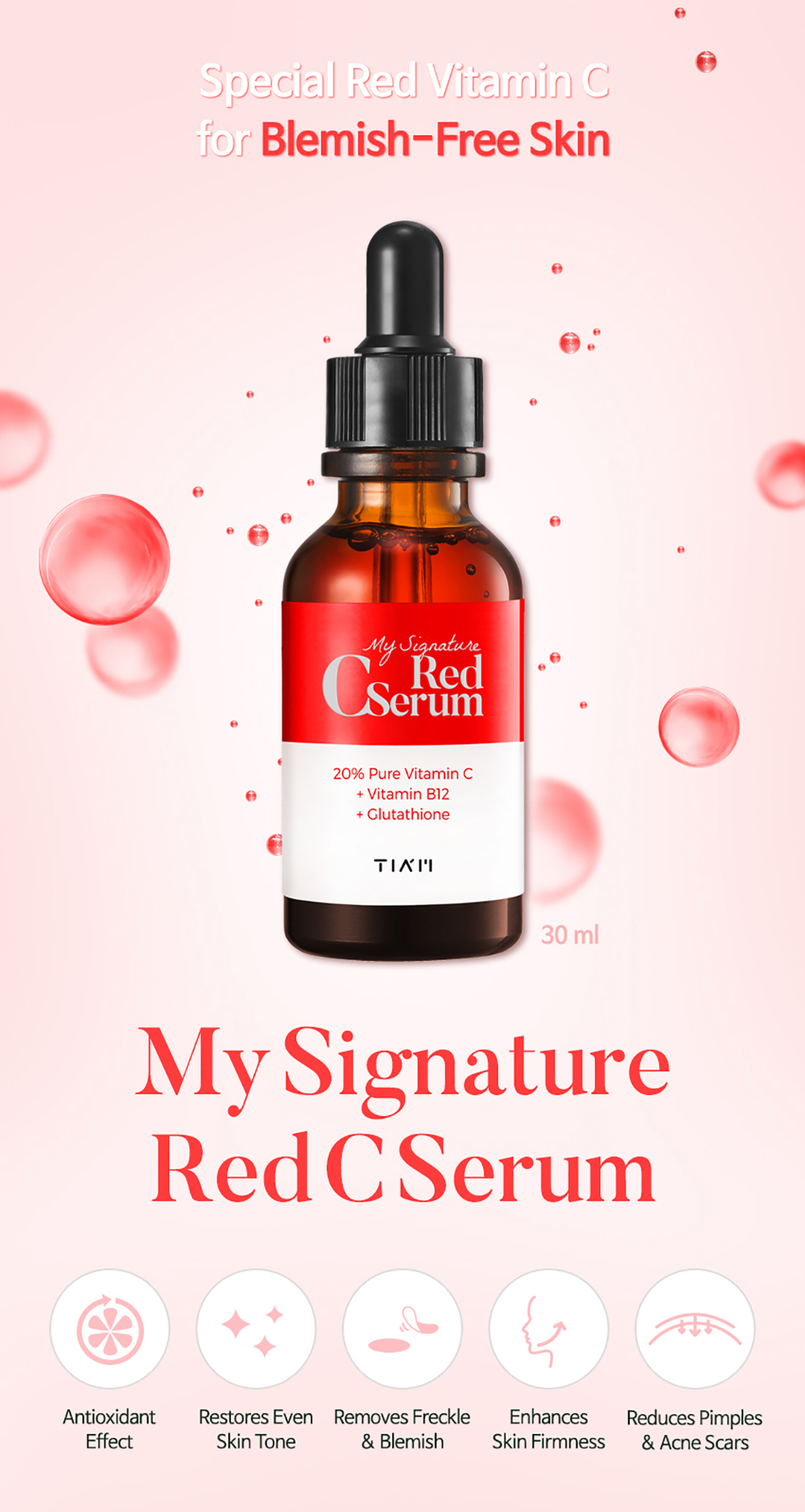 Tiam my signature red c serum containing 20% pure vitamin c helps reduce blemishes, hyperpigmentation and signs of aging. Also enriched with vitamin b12 to soothe skin, plus glutathione and niacinamide. Dropper and the serum packed separately.